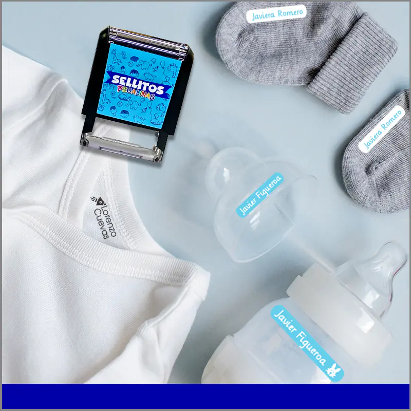 Este es el paquete ideal para cuando tu hij@ va a la guardería o al Kinder. Personaliza el sello y todas las pegalinas con el nombre de tu hij@. Ideal para marcar todas sus pertenencias como pañales, ropa, bolsas de tela, útiles, tuppers, envases de todo tipo, cajas y un sinfín de productos más.