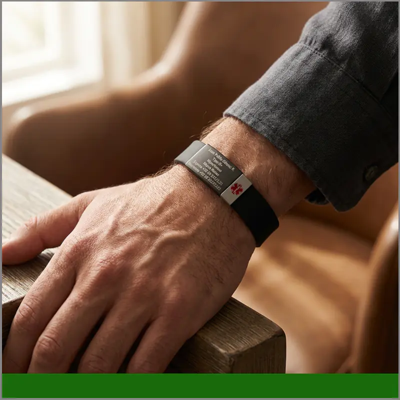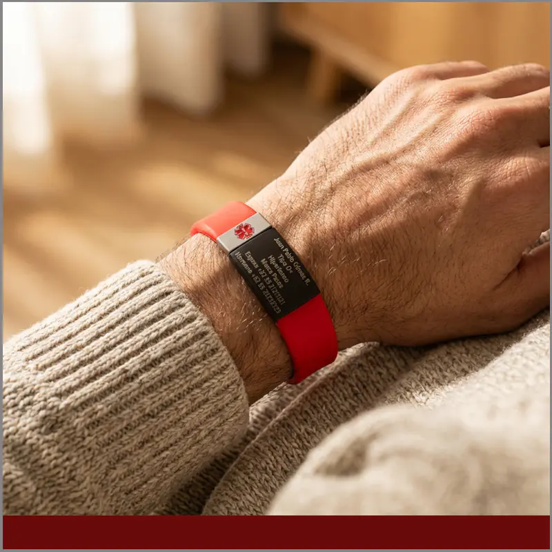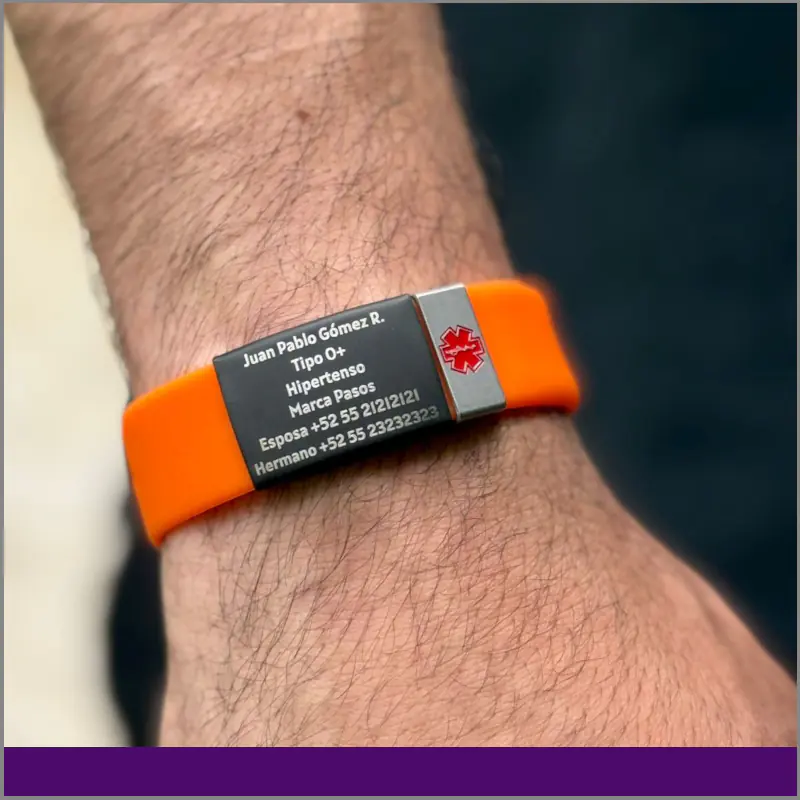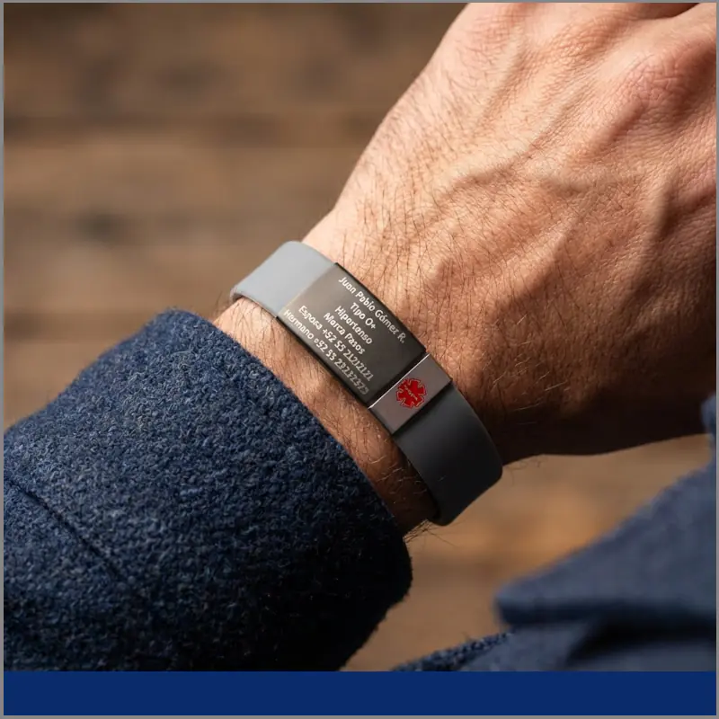 Brazalete de identificación para emergencias con placa grabada + banda de silicón ajustable en colaboración con VITAL+ID, marca especializada en dispositivos de alerta personal.