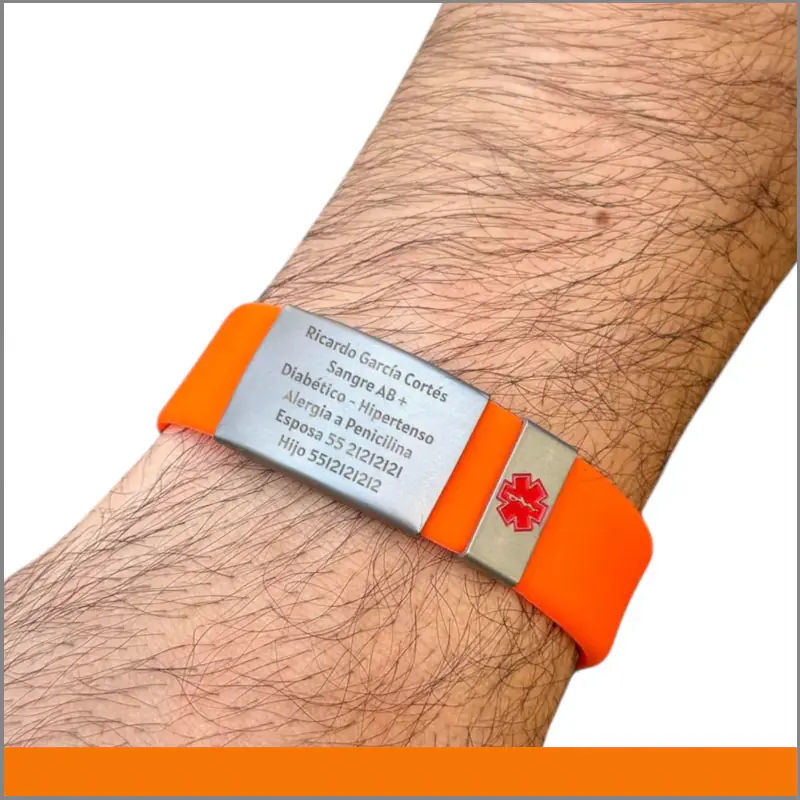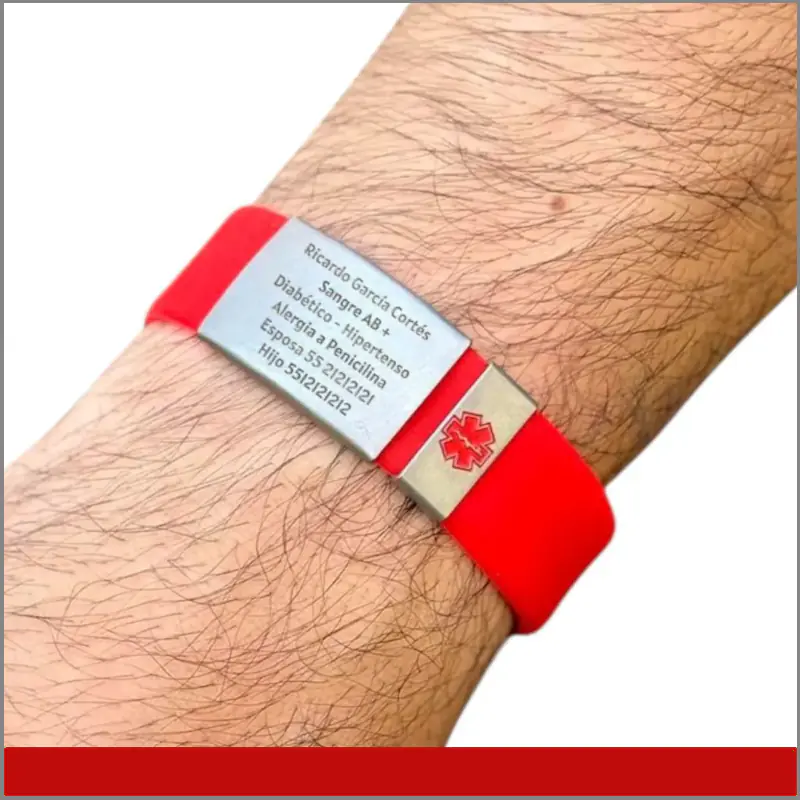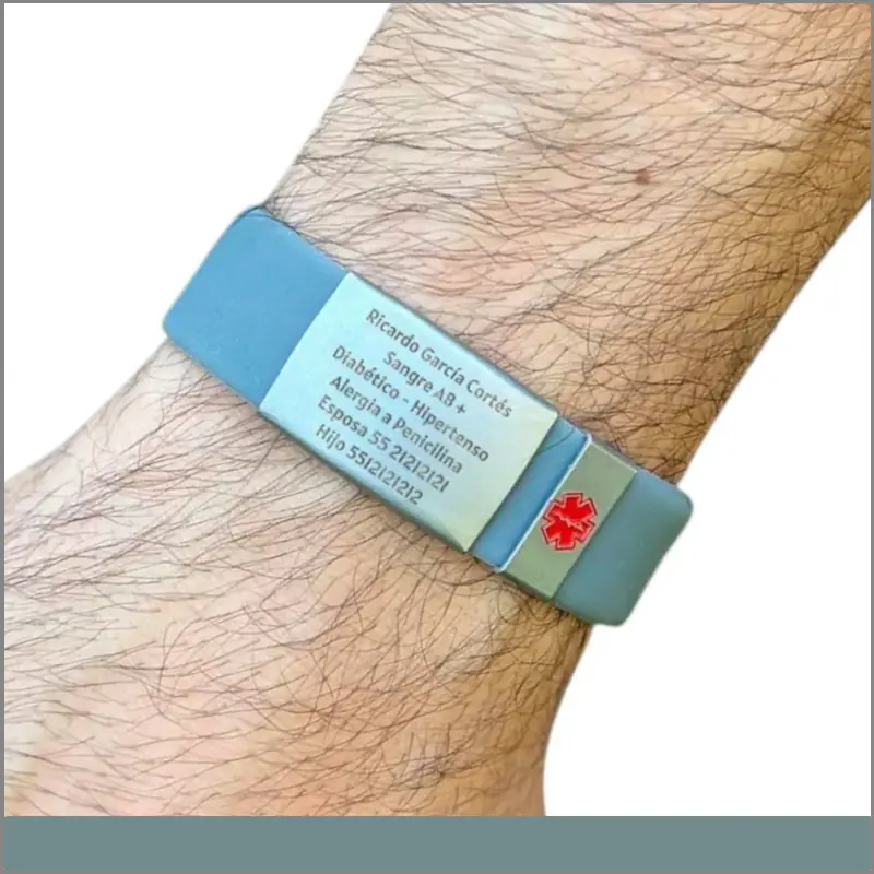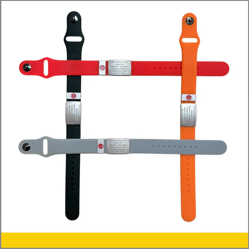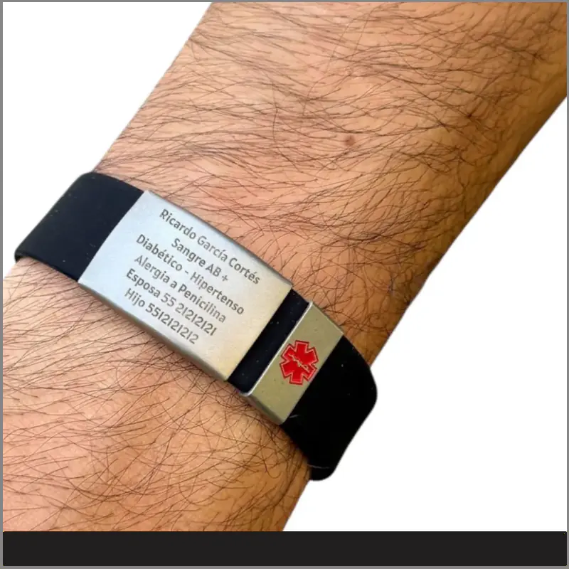 Brazalete de identificación para emergencias con placa grabada + banda de silicón ajustable en colaboración con VITAL+ID, marca especializada en dispositivos de alerta personal.