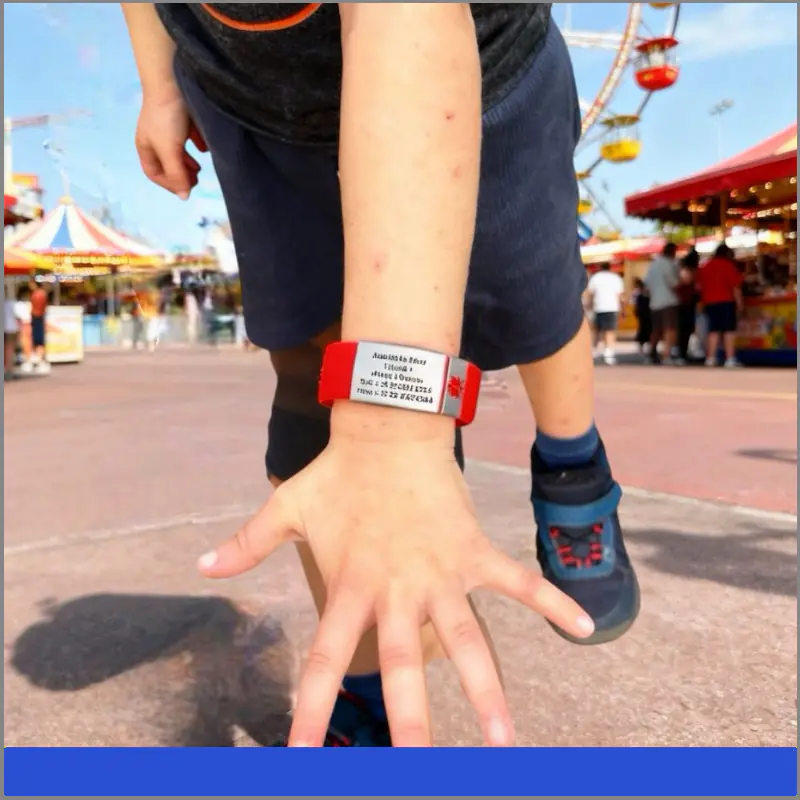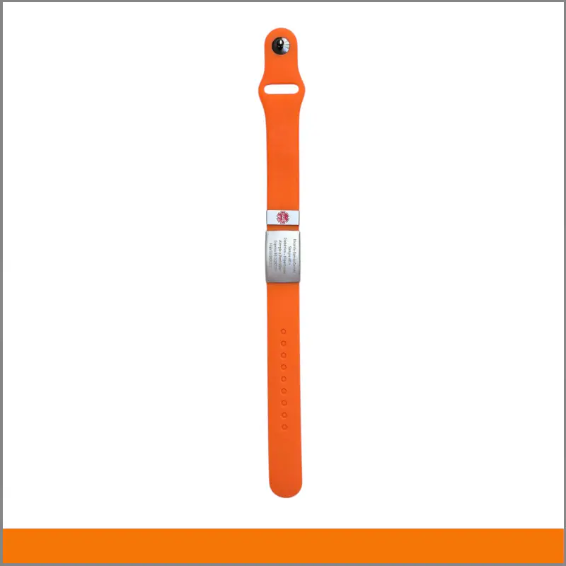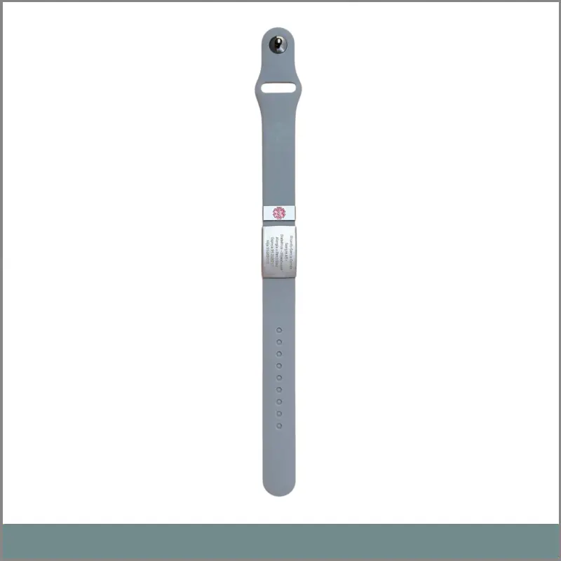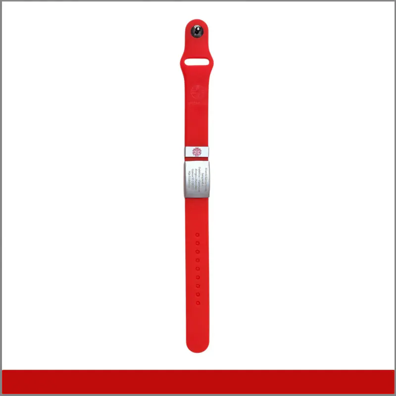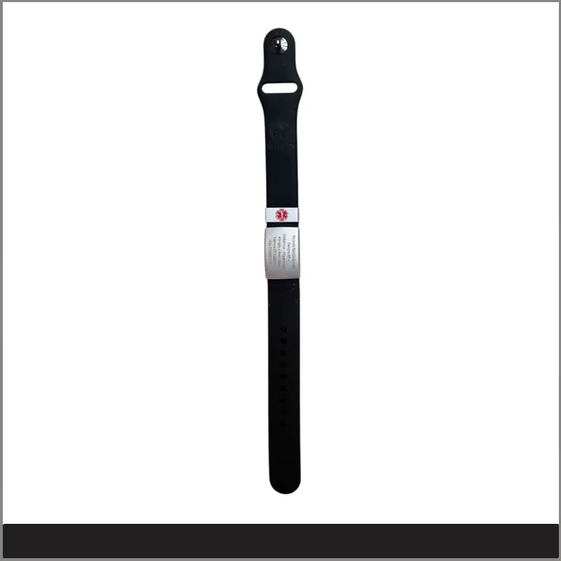 Brazalete de identificación para emergencias con placa grabada + banda de silicón ajustable en colaboración con VITAL+ID, marca especializada en dispositivos de alerta personal.